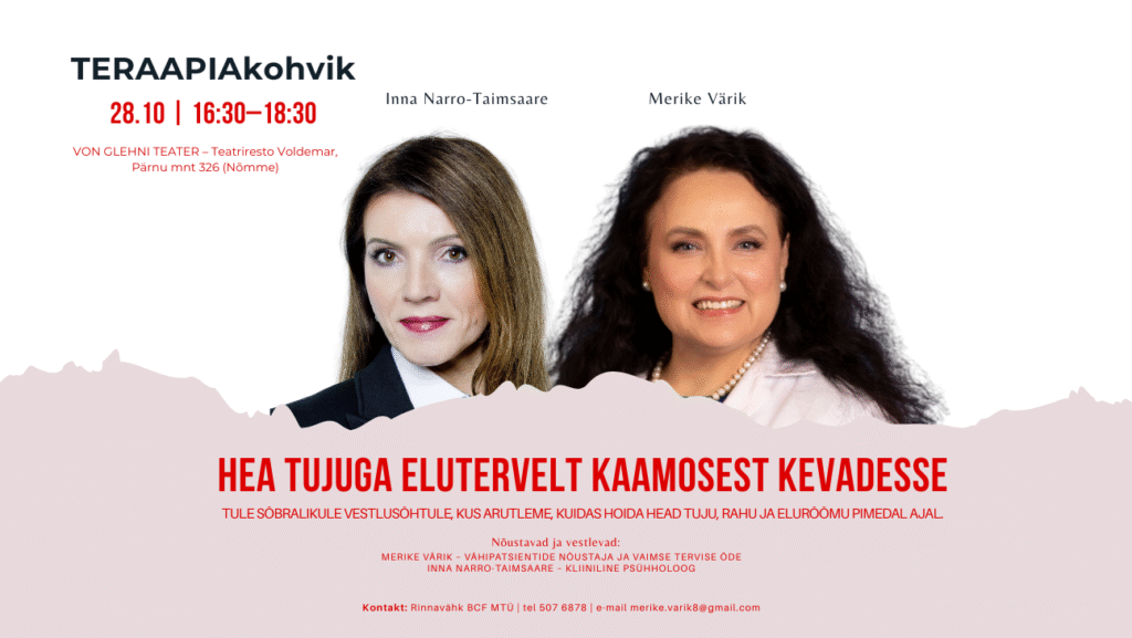 Sügis ja talv võivad tuua endaga kaasa väsimuse, meeleolu languse ja motivatsioonipuuduse. TERAAPIAkohvikusse on oodatud kõik, kes soovivad sõbralikus ja toetavas õhkkonnas arutleda, kuidas hoida head tuju, sisemist rahu ja elurõõmu ka pimedal ajal.