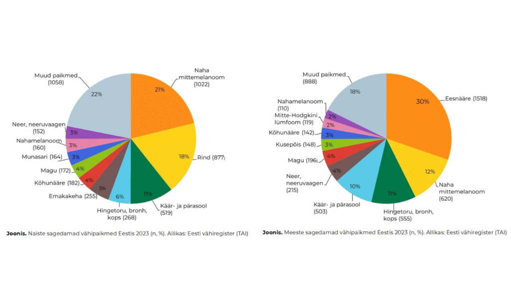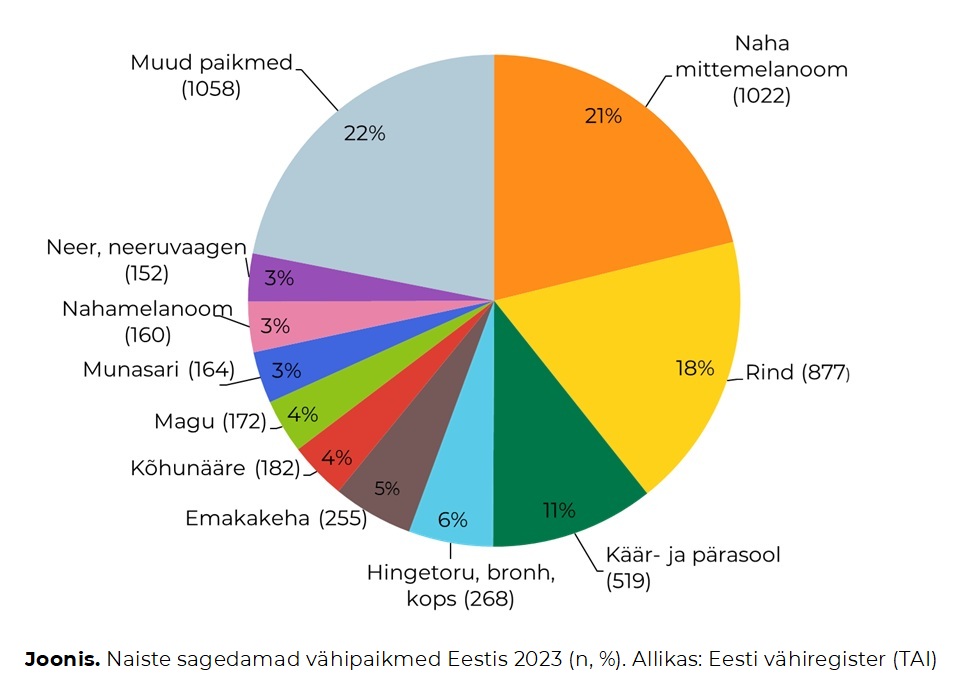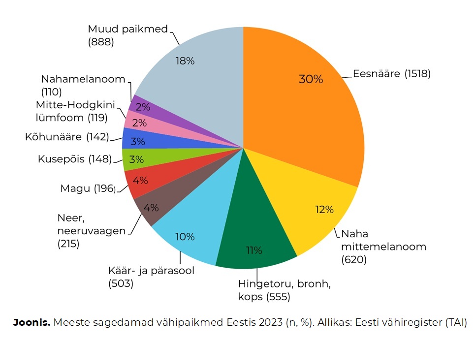 Tervise Arengu Instituudi (TAI) hallatava vähiregistri andmetel diagnoositi Eestis 2023. aastal 9843 vähi esmasjuhtu, neist meestel 5014 ja naistel 4829. Vähidiagnooside sagenemise põhjuseks on tõenäoliselt nii rahvastiku vananemine, tervishoiusüsteemi taastumine pandeemia mõjudest kui ka sõeluuringutel osalemise kasv.